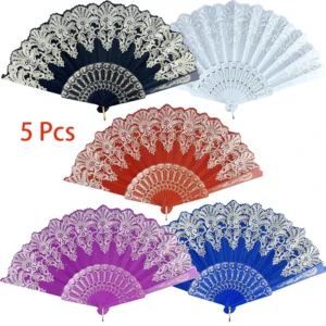 5 Pieces Chinese Style Gold Powder Lace Fan Hand Painted Plastic Folding Dance Party Decor Halloween Wedding Gift