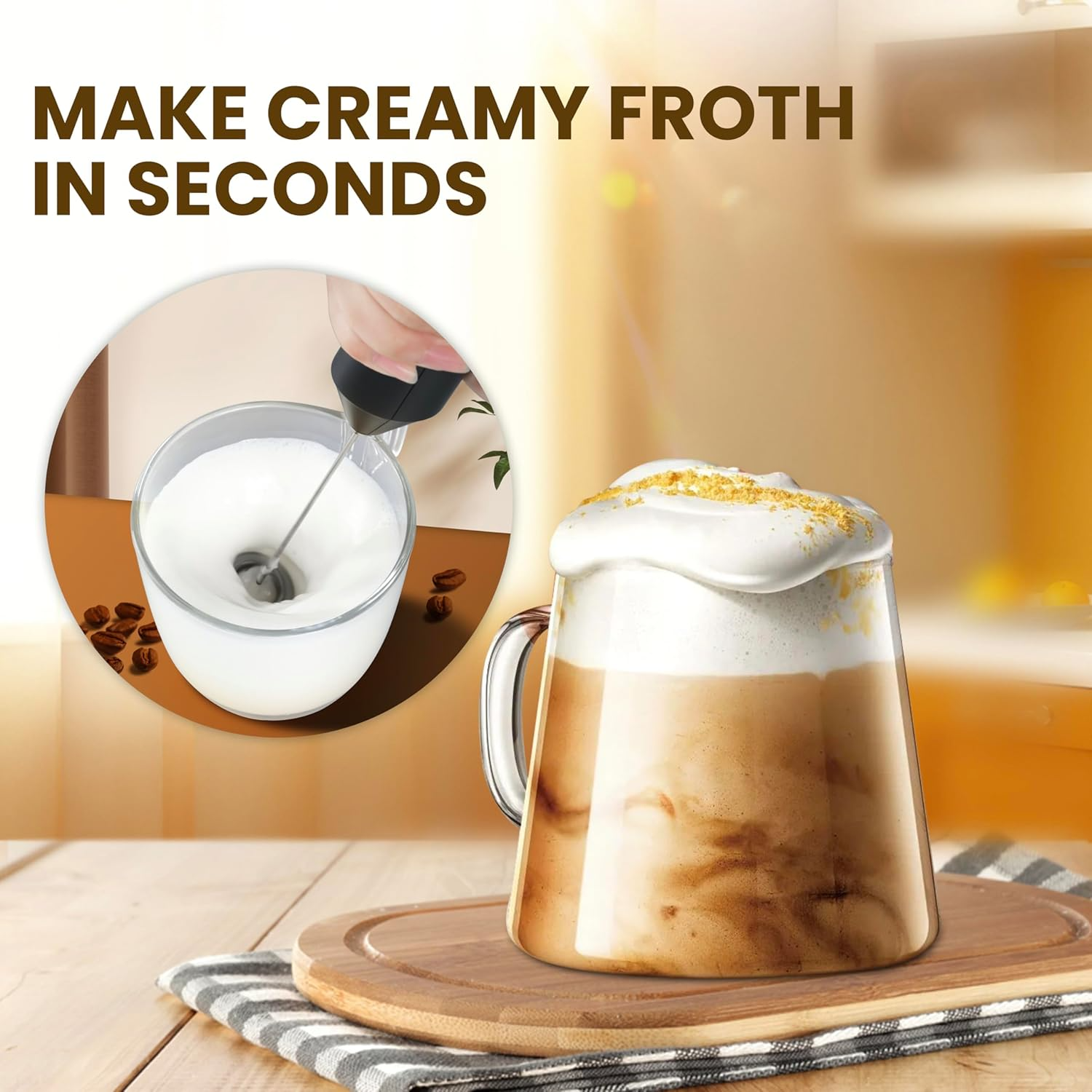 1. Enjoy cafe-quality lattes and cappuccinos at home with our sleek black Milk Frother with Stainless Steel Stand. This battery-operated whisk maker is perfect for creating frothy drinks like matcha and hot chocolate in minutes.